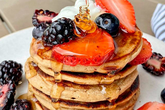 Estos pancakes son uno de los desayunos más deliciosos que habrás probado. Y lo mejor es que los puedes preparar con tu proteína HABITS by NFK y hacerlos más nutritivos. Esta receta rinde para 6 pancakes.